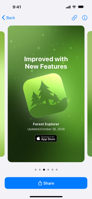 使用你在 App Store Connect App 中生成的营销素材为 App 或游戏的重要时刻大力宣传,例如 App 或游戏发布、新版本上市或入选 App Store 精选推荐。从各种视觉素材中进行选择,然后分享到你所选的社交媒体渠道,鼓励用户下载你的 App 或与之互动。如果你的 App 或游戏出现在 Today 标签页上的展示位置中,例如成为推荐的“今日 App”或“今日游戏”,你将通过 App Store Connect App 收到通知。