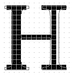 The grid-fitting instructions for the H necessarily refer to the outline points that make up the glyph description. Figure 11 shows the upper case H outline along with the on-curve and off-curve points that define that outline. The instructions for this glyph follow. Each instruction is accompanied by an explanation of the work it does and, if relevant, an illustration of the points it affects or uses.The instructions begin with the x-direction, the default direction for the freedom and projection vectors.The work of instructing the glyph proceeds from left to right. Instructions80% in the y-direction follow.
