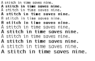 The best test of whether a font is successful is to view examples that are typical of the expected use. Look at examples of what you intend to print. If a font is expected to serve as a screen font on a 72 dpi device, look at sample test at 10 and 12 point on the screen. Other tests can be useful, however, in isolating particular problems.The waterfall, a line of text that is repeated at sizes that decrease by one pixel per em, makes weight jumps more apparent. A waterfall with screen fonts is shown in Figure 25. Figure 25 shows the same text on a high resolution printer.