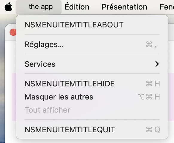 In the menubar, some subitems are improperly labelled, featuring NSMENUITEMTITLEABOUT or NSMENUITEMHIDE or NSMENUITEMTITLE instead. Looks like it cannot find the name of the app.