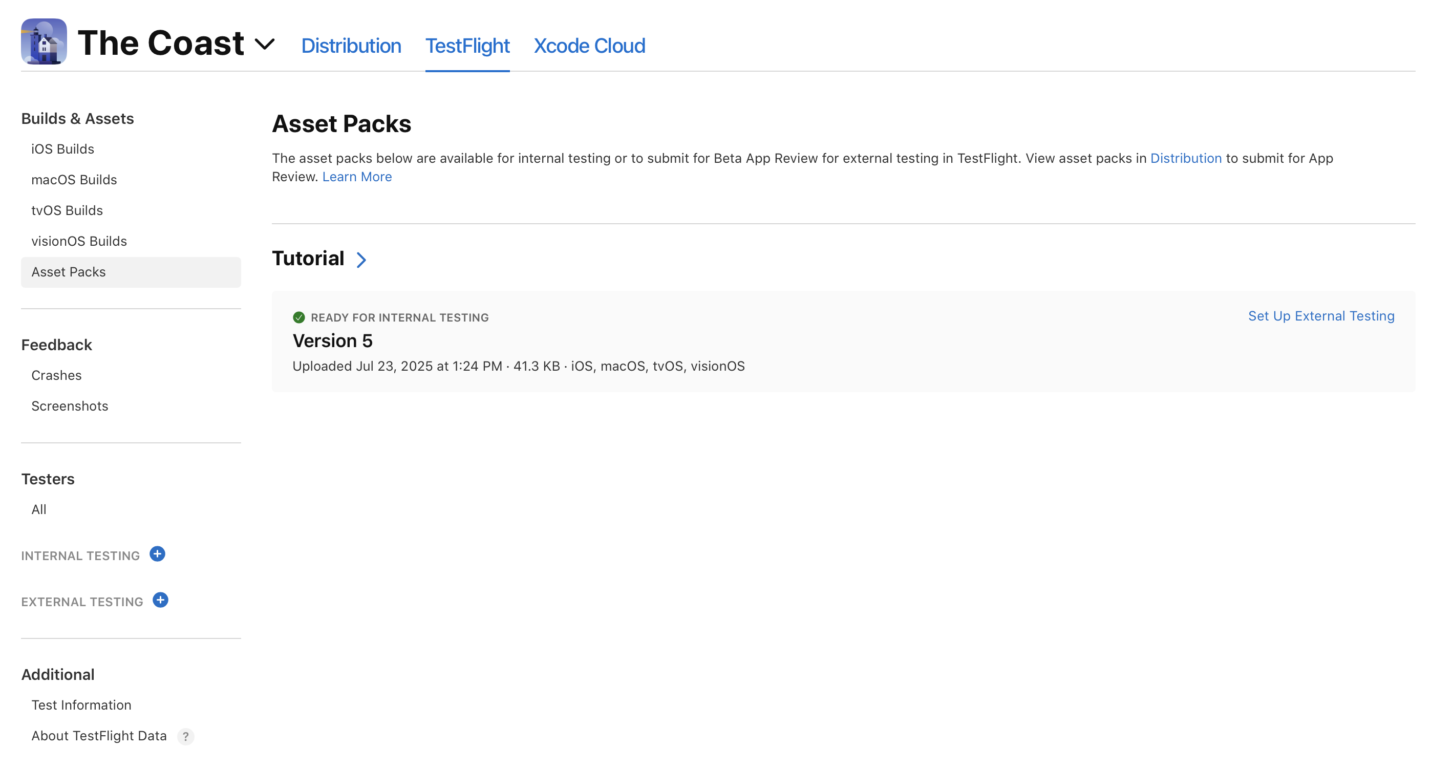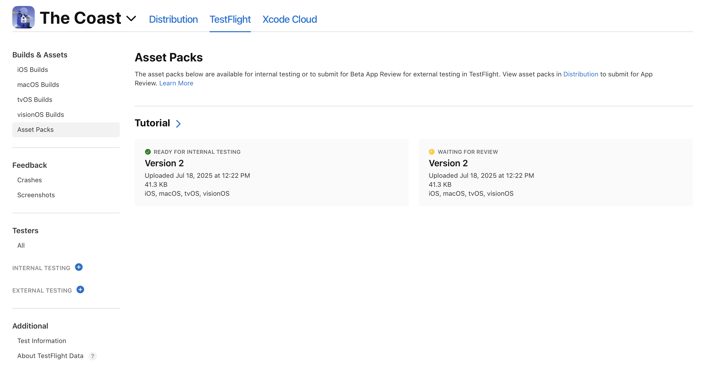 TestFlight automatically uses the latest processed version of an asset pack for internal testing. For external testing, you can choose a version to submit to TestFlight App Review. Once approved, it’ll automatically be available to test with external testers. Only one version can be in external testing at a time.