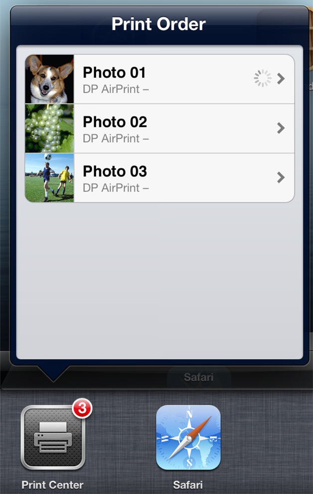 Once a print job has been submitted and is either printing or waiting in the print queue, users can check on its status by double-tapping the Home button to access the Print Center in the multitasking UI. The Print Center (shown in Figure 5-4) is a background system app that shows the order of jobs in the print queue, including those that are currently printing. It is only available while a print job is in progress.