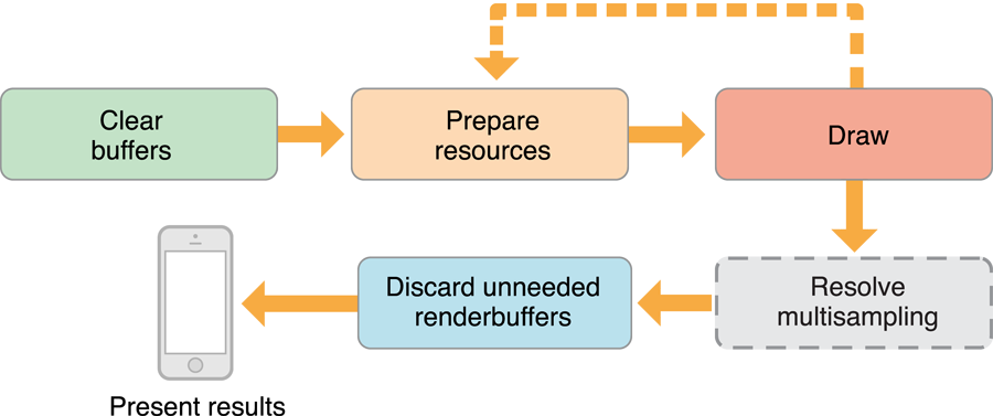Figure 4-3 shows the steps an OpenGL ES app should take on iOS to render and present a frame. These steps include many hints to improve performance in your app.