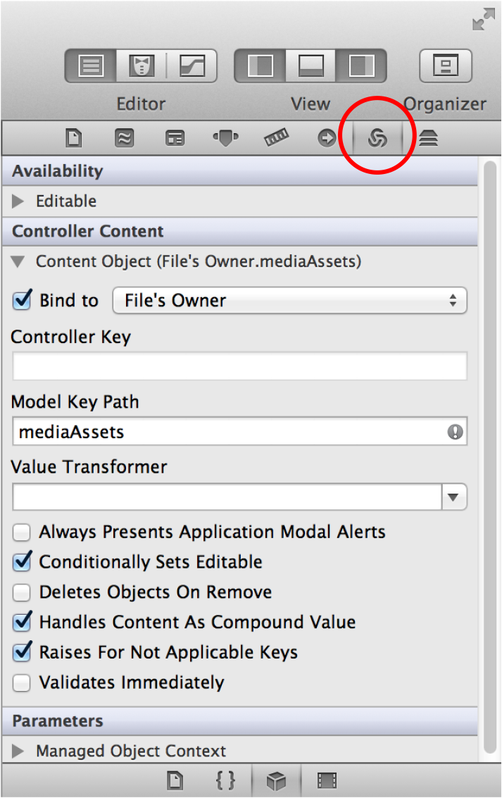 1. Set the Bind to aspect to the object that maintains the collection of model objects (for example, the File’s Owner).