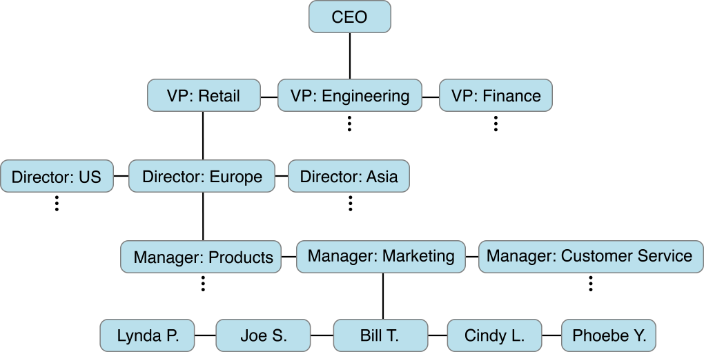 If you consider the hierarchy of the hypothetical company shown in Figure 1, the root array consists of a single entry for the CEO. The array below that consists of the various vice presidents. Below each vice president is an array of directors, and so on. If you want to store the position of a particular employee on the Europe marketing team, for instance, a simple index is not enough. Instead a path through the nested arrays is necessary. In this case, Bill T. can be represented by the index path 0.0.1.1.2.