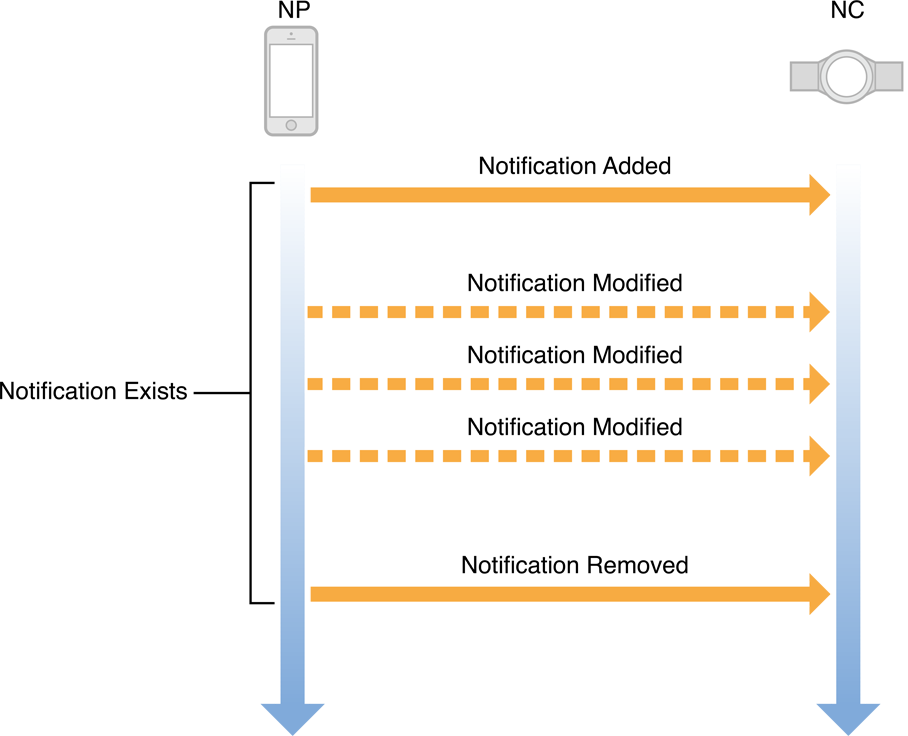 The lifetime of an iOS notification can be implicitly deduced through the sequence of Notification Source GATT notifications generated by the NP, as shown in Figure 2-2.