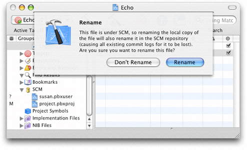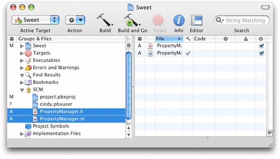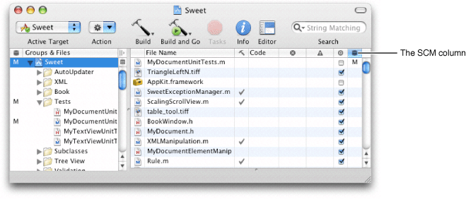 Xcode’s detail view lists all the files in a project. When using version control, you can add the SCM column to the detail view by selecting the project group in the Groups & Files list and choosing View > Detail View Columns > SCM. The SCM column shows the status of each file in the project. Figure 22-2 shows the SCM column in Xcode’s detail view.