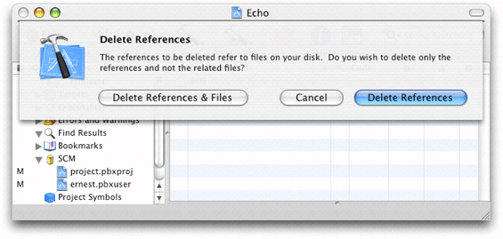 To remove a file from your local copy of a project and from the repository when you commit the operation, remove the file as you normally would; that is, select the file in the project window and choose Edit > Delete or press Command-Delete. The Delete References dialog, shown in Figure 22-6, appears.