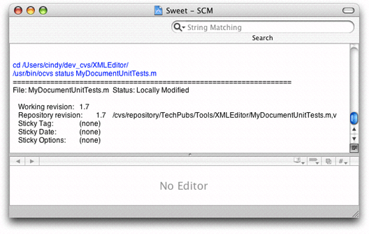 The SCM pane in the inspector or a file’s Info window contains a list of each revision of the file. The information displayed in the list includes the revision number, the author, and a message about the changes made. The change message may be truncated in the list. To see the entire change message for a revision, select the revision in the revision list. The change message, as well as the other properties of the list, appears in the text field below the revision list. Figure 22-11 shows the revision of a file in an Info window.