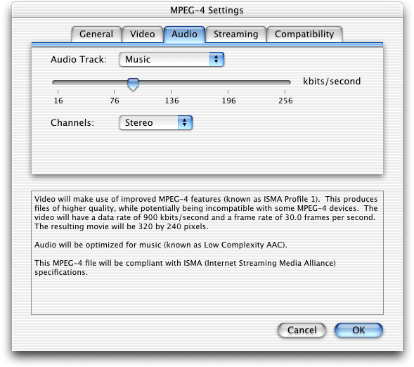 .mp4file or a QuickTime.movfile using MPEG-4 compression. This allows you to mix MPEG-4 audio and video with other QuickTime media, such as VR panoramas, sprites, or Flash tracks. Discussed in the section MPEG-4 and Web Developers.A new group of MPEG-4 settings dialogs in QuickTime Player that enable QuickTime Pro users who work with MP4 files to make a number of adjustments in video and audio tracks, streaming and compatibility. Discussed in the section Working with MPEG-4 Files.