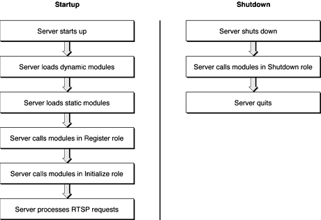 QTSS_RTSPFilter_Role,QTSS_RTSPRoute_Role,QTSS_RTSPAuthenticate_Role,QTSS_RTSPAuthorize_Role,QTSS_RTSPPreProcessor_Role,QTSS_RTSPRequest_Role,QTSS_RTSPPostProcessor_Role, andQTSS_RTSPSessionClosingRole. The RTSP session also calls modules in theirQTSS_RTSPIncomingData_Role. The RTP session handles the following role calls as well as data reads and writes:QTSS_RTPSendPackets_Role,QTSS_RTCPProcess_Role, andQTSS_ClientSessionClosing_Role. For more information about roles, see Module Roles.