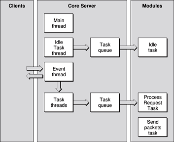 Figure 1-1 summarizes the relationship between clients, the core server’s threads, and server modules.