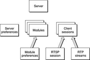 The server object has a a dictionary of preferences. The server owns a list of modules each with a dictionary for their preferences. The server owns a list of RTP client sessions, each of which can have an RTSP session and one or more RTP media streams. It is possible to use the API to walk all of the server’s the live sessions and streams.
