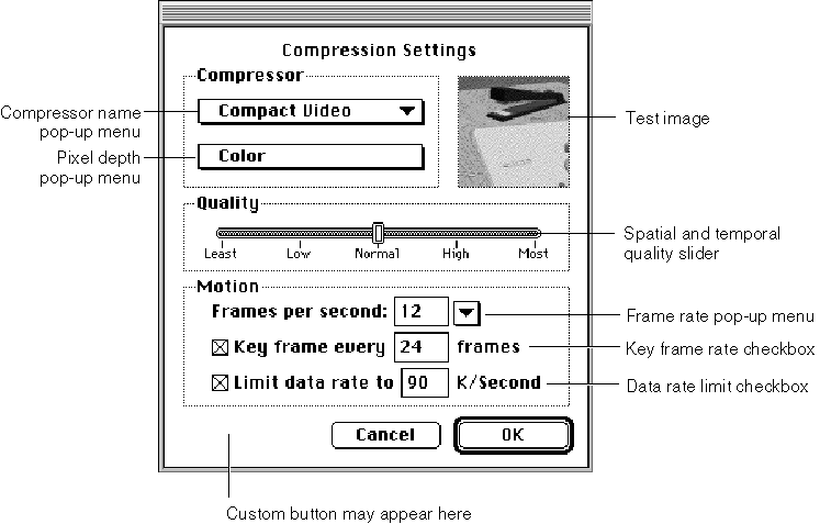 The standard image compression dialog component provided by Apple allows you to augment or extend the interface provided by its dialog boxes. This component supports a single custom button. Your application enables this button when it instructs the component to display the dialog box to the user. You provide the code that supports this button in a hook function in your application. In addition, this component allows you to define a filter function; you can use this function to process dialog box events before the component. Figure 14-1 identifies the parts of the dialog box supported by Apple’s standard dialog component.