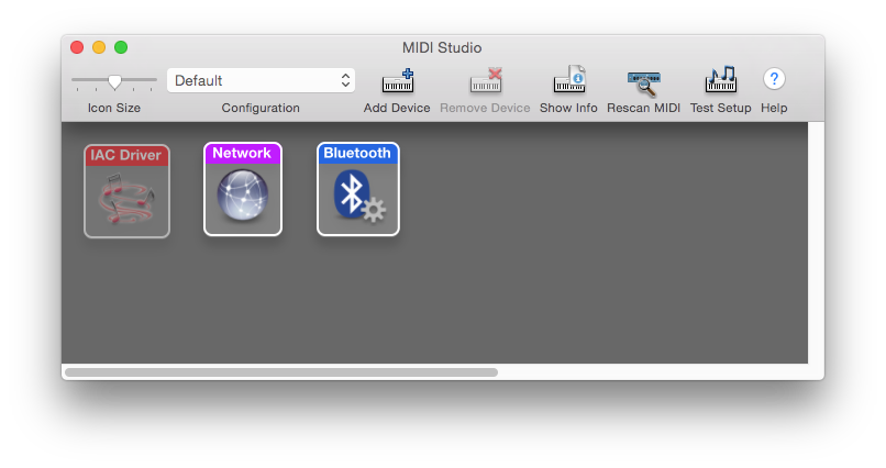 The Audio MIDI Setup applications provides a Bluetooth configuration icon in the MIDI Studio Panel (see Figure 1) that allows a Mac to play the role of either Central or Peripheral.