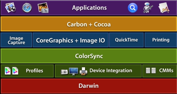 As Figure 1 shows, ColorSync is built into the system at a low level on top of Darwin. Built on top of ColorSync are a variety of graphics frameworks providing a diverse set of functionality, and most all of these frameworks make use of color management provided by ColorSync.