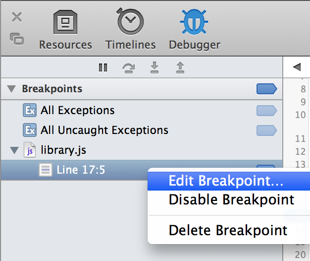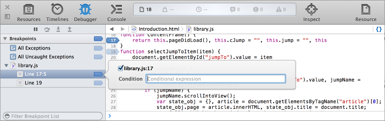 Every breakpoint you set across all your scripts appears under Breakpoints in the navigation sidebar, as shown in Figure 4-2. Clicking the line jumps the text in the content browser to the line with the breakpoint. The breakpoint icon to the right of the line number allows you to enable and disable the breakpoint without removing it.