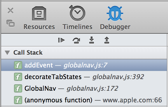 Use the buttons above the call stack to have line-by-line control of where the debugger pauses execution next. The buttons have the following behavior: