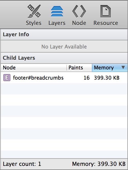 To see which elements on your page are rendered in their own layer, select the root html node in the content browser. Any elements composited in a layer appear here, as shown in Layers. Clicking on the row in this table causes a popover to appear, explaining the reasons for compositing. When possible, minimize the number of layers present by eliminating the element’s need for compositing. Clicking the arrow that appears on hover jumps to the node’s location in the content browser.