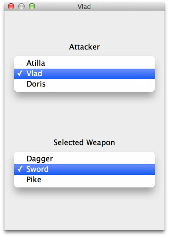 Consider a game application in which the user manages a number of combatants, from which they can select one as an attacker. A combatant can carry three weapons, one of which is selected at any time. In the application, the list of combatants is shown in a table view, the window’s title shows the attacker’s name, and a pop-up menu shows the currently selected weapon, as shown in Figure 11.