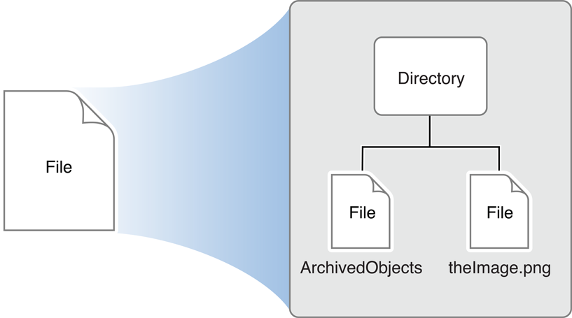 A file package has an internal structure that is reflected in the methods of the NSFileWrapper class. A file wrapper is a runtime representation of a file-system node, which is either a directory, a regular file, or a symbolic link. As shown in Figure 3-1, a file package is a file-system node, typically a directory and its contents, that the operating system treats as a single, opaque entity. It is similar in concept to a bundle.