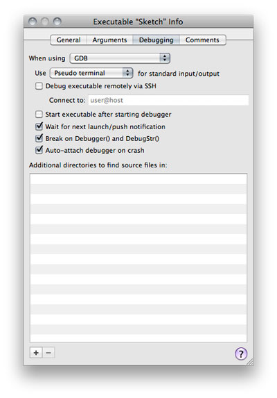 Executable environments specify a set of debugging-specific items that specify which debugger to use, as well as how Xcode communicates with the debugger. (You debug a product when you start it with breakpoints activated.) You configure these items in the Debugging pane of the Executable Info window, shown in Figure 10-3.