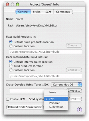 2. Choose your version control system from the SCM System pop-up menu in the General pane in the Project Info window, shown in Figure 21-1.