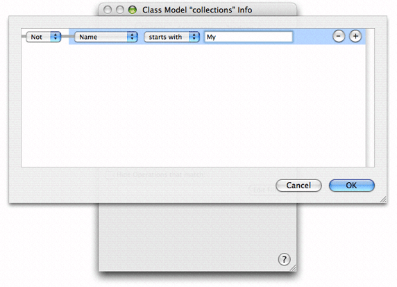 You can set up independent filters for classes, properties, and operations, based on their name and kind. You can also toggle filters on and off as required. If you click Edit Filter, a sheet in which you can edit the filter appears, as shown in Figure 11-5. You can either enter a predicate directly into the appropriate text field or use the predicate builder (see The Predicate Builder).