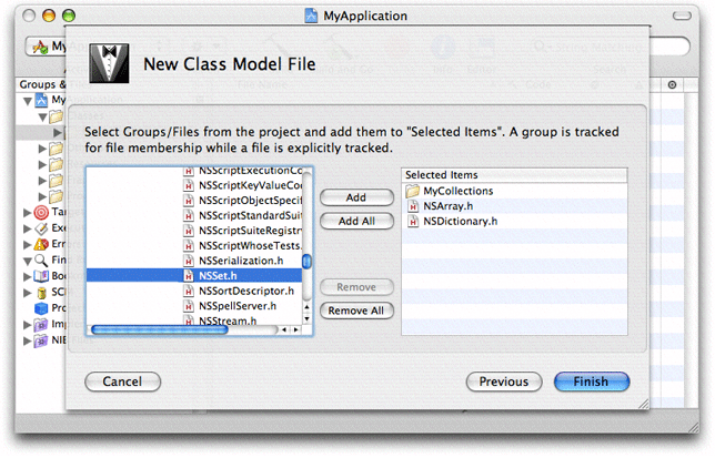 When you create a model, you add the source or the header files (or both), or containers (such as groups, targets, or projects, but not smartgroups, build phases, find results, and so on) that you want to contribute to the model. A model is dynamic, though. It is continuously updated in response to changes in your source code and the organization of your project. For this reason, you might add both a file and a group containing that file to a model, so that if the file is moved out of group it remains in the model (this strategy may be particularly useful early in a project’s lifetime when groups are likely to change).