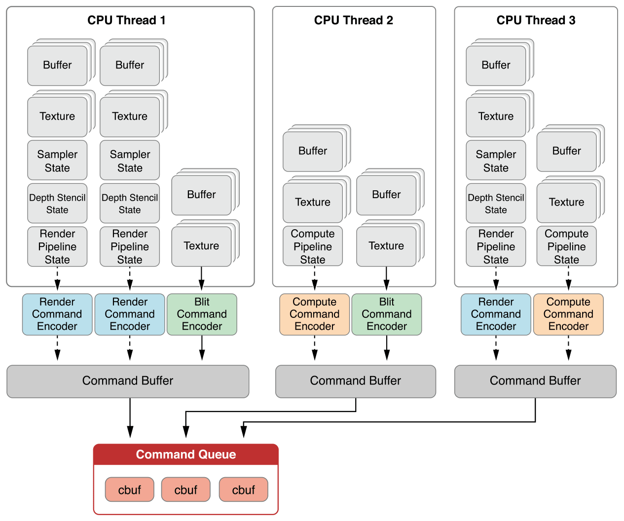 Figure 2-1 shows how the command queue, command buffer, and command encoder objects are closely related. Each column of components at the top of the diagram (buffer, texture, sampler, depth and stencil state, pipeline state) represent resources and state that are specific to a particular command encoder.