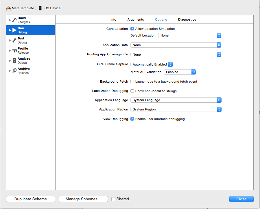 When a Metal app is running from Xcode, the default scheme settings reduce performance. Xcode detects whether the Metal API is used in the source code and automatically enables the GPU Frame Capture and Metal API Validation settings, as seen in Figure 8-2. When GPU Frame Capture is enabled, the debug layer is activated. When Metal API Validation is enabled, each call is validated, which affects performance further. For both settings, CPU performance is more affected than GPU performance. Unless you disable these settings, app performance may noticeably improve when the app is run outside of Xcode.