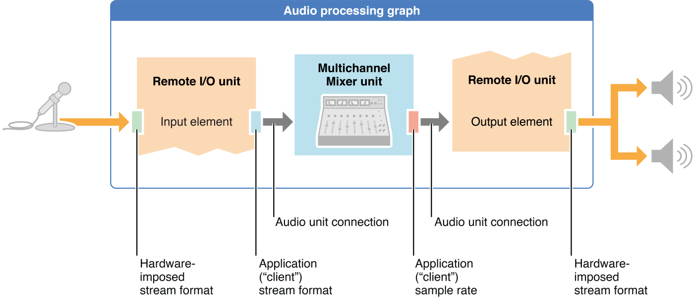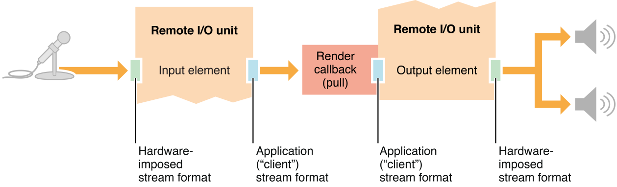 As you can see in the figure, the audio input hardware imposes its stream format on the outward-facing side of the Remote I/O unit’s input element. You, in turn, specify the format that you want to use on the inward-facing side of this element. The audio unit performs format conversion as needed. To avoid unnecessary sample rate conversion, be sure to use the audio hardware sample rate when defining your stream format.