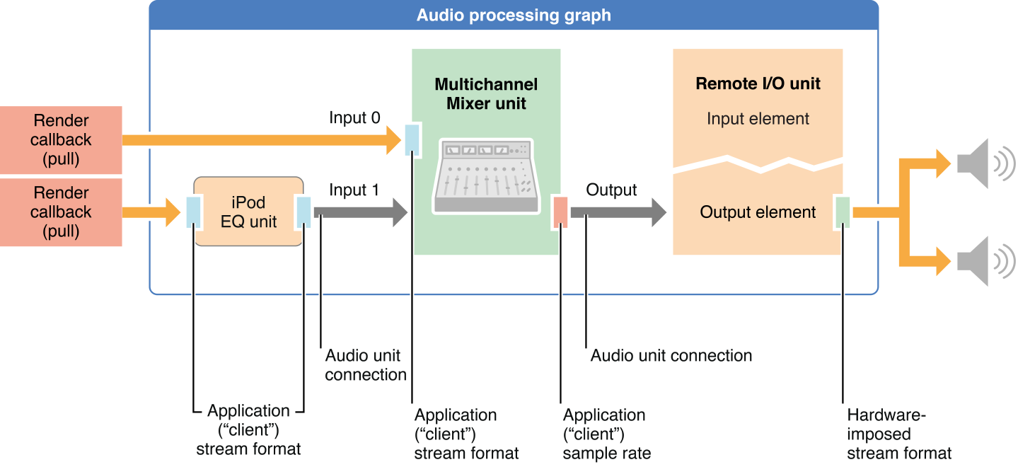 For design patterns that employ render callback functions, you must write those functions and then attach them at the correct points. Render Callback Functions Feed Audio to Audio Units describes what these callbacks do and explains how they work. For examples of working callbacks, view the various audio unit sample code projects in the iOS Reference Library including Audio Mixer (MixerHost) and aurioTouch, and SynthHost.