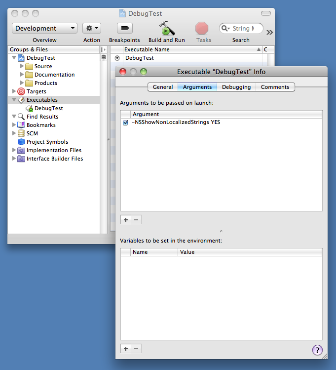 Some debugging facilities are enabled by setting a special preference. You can set such a debugging preference by configuring a command line argument in Xcode. Figure 2 shows how this is done.