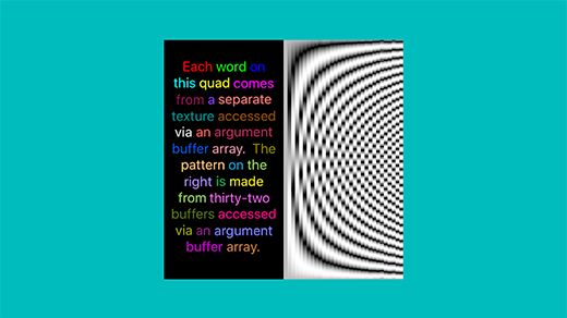 View sample codeReduce CPU overhead by using arrays inside argument buffers and combining them with resource heaps. This sample shows how to define an argument buffer structure that contains arrays and how to allocate and use resources from a heap.