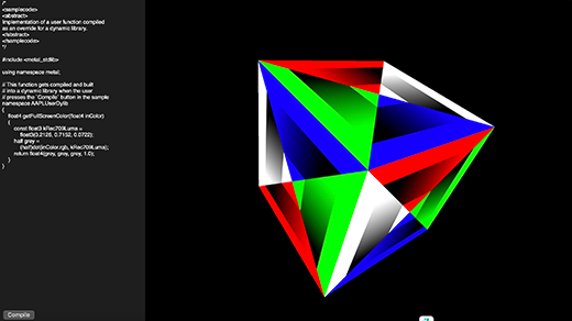 View sample codeCompile a library of shaders and write it to a file as a dynamically linked library. This sample displays a rudimentary source editor to develop and compile a Metal function into a dynamic library, linking to the library and then invoking the function from a shader.