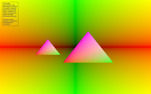 Download sample codeUtilize the Metal shader converter to convert HLSL ray query shaders into Metal IR. Employ these converted shaders to render two triangles, displaying their barycentric coordinates.