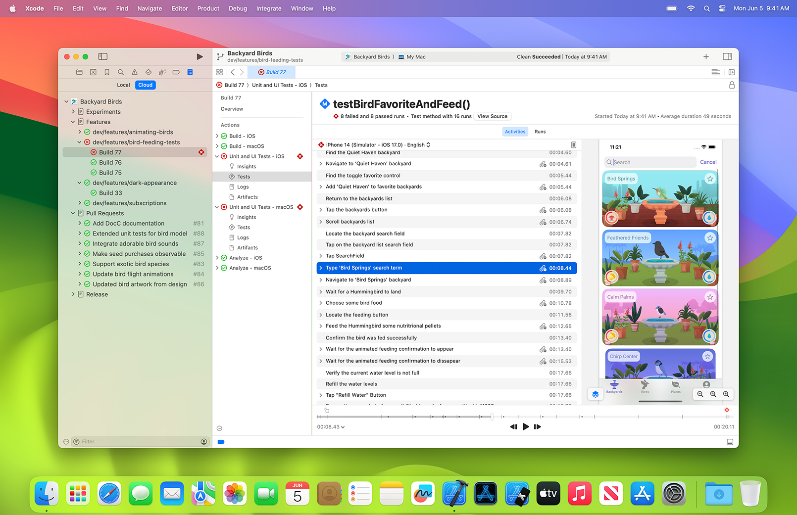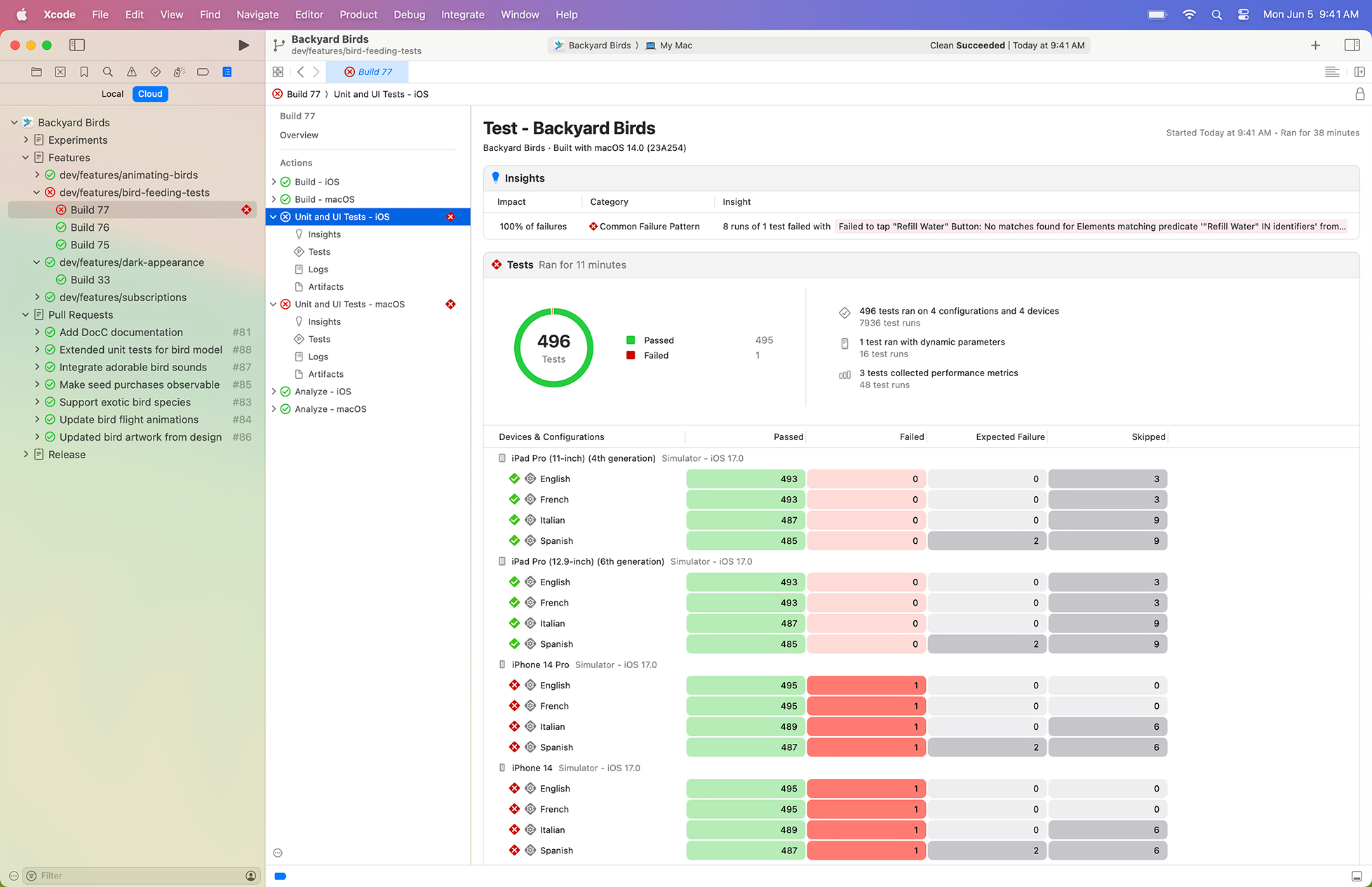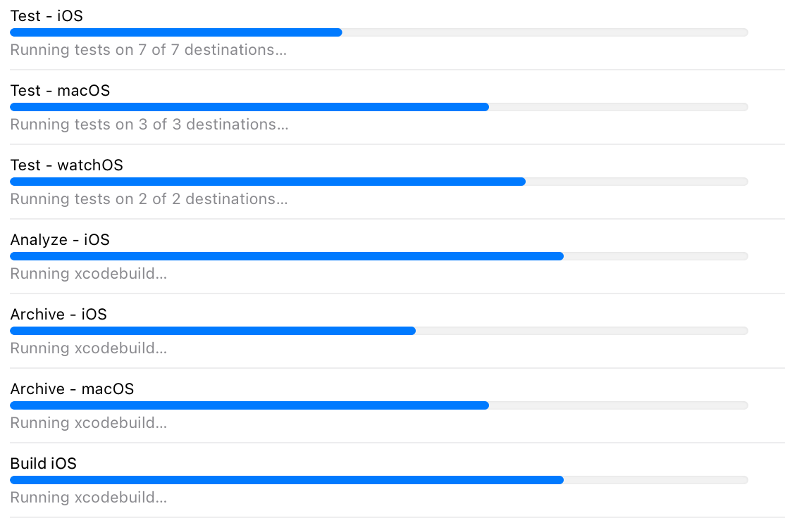 Results for your builds and tests — and even feedback on crashes from users — are presented right inside Xcode. As builds happen in the cloud, Xcode shows live status indicators and lets you filter by the build tasks you want to monitor.